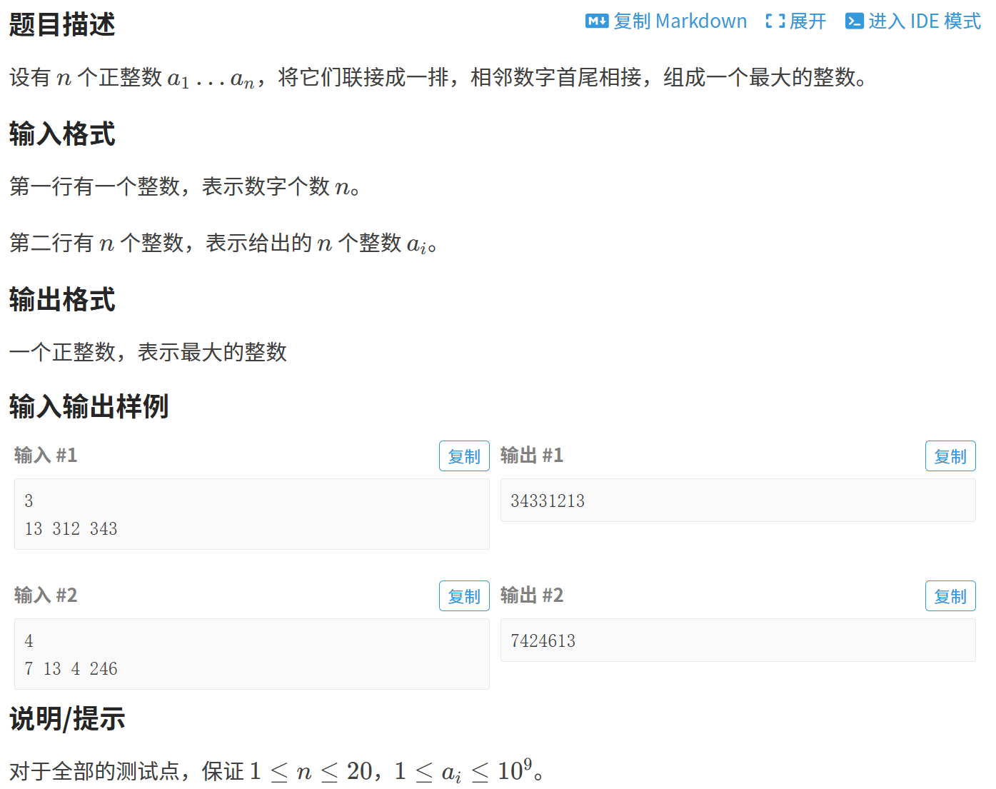 {cin >> n;for (int i = 1;i <= n;i++)cin >> a[i];sort(a + 1, a + 1 + n, cmp);for (int i = 1;i <= n;i++)cout << a[i];return 0;