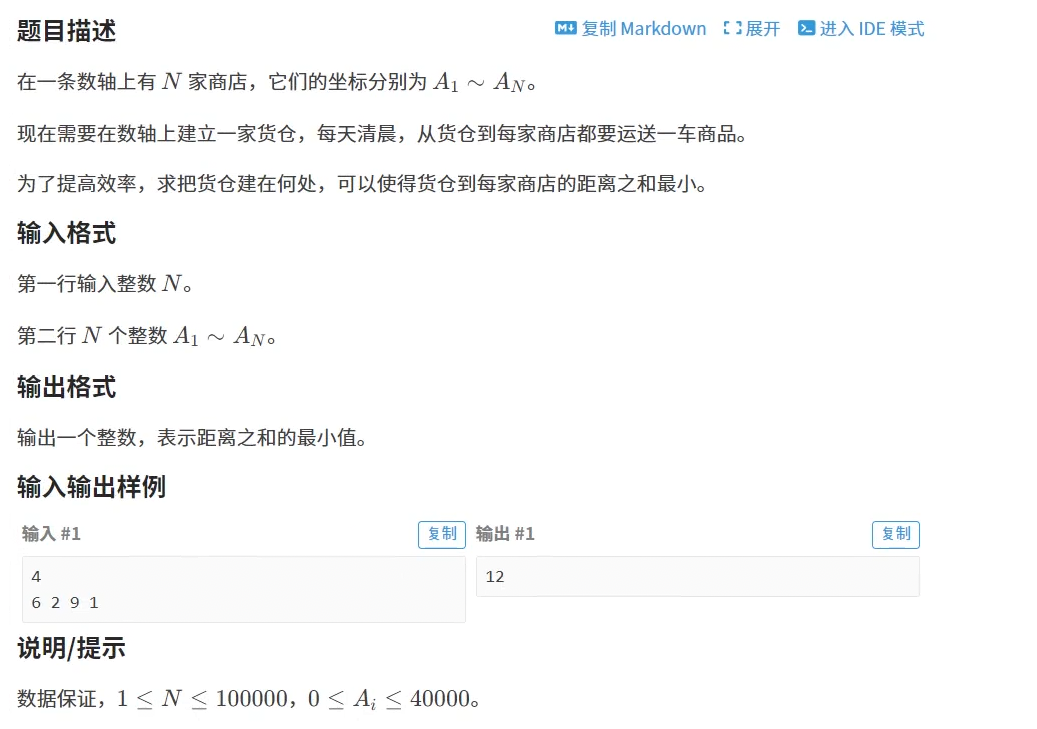 根据贪心的思想,我们最希望把仓库建在中间位置。