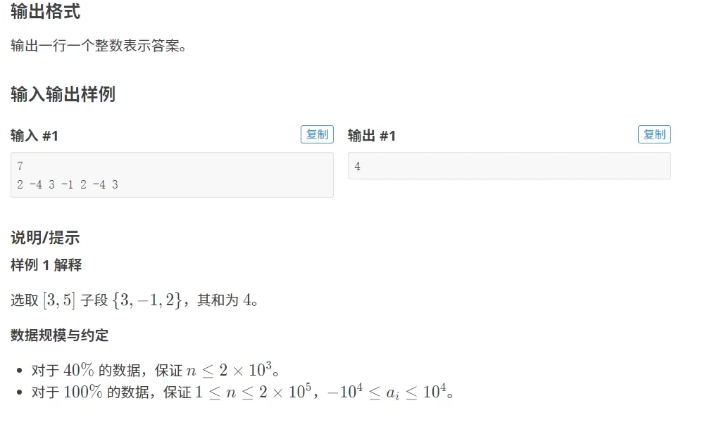 {cin >> n;for (int i = 1;i <= n;i++)cin >> a[i];long long ret = -1e6, sum = 0;for (int i = 1;i <= n;i++){sum += a[i];ret = max(ret, sum);if (sum < 0)sum = 0;}cout << ret << endl;return 0;
