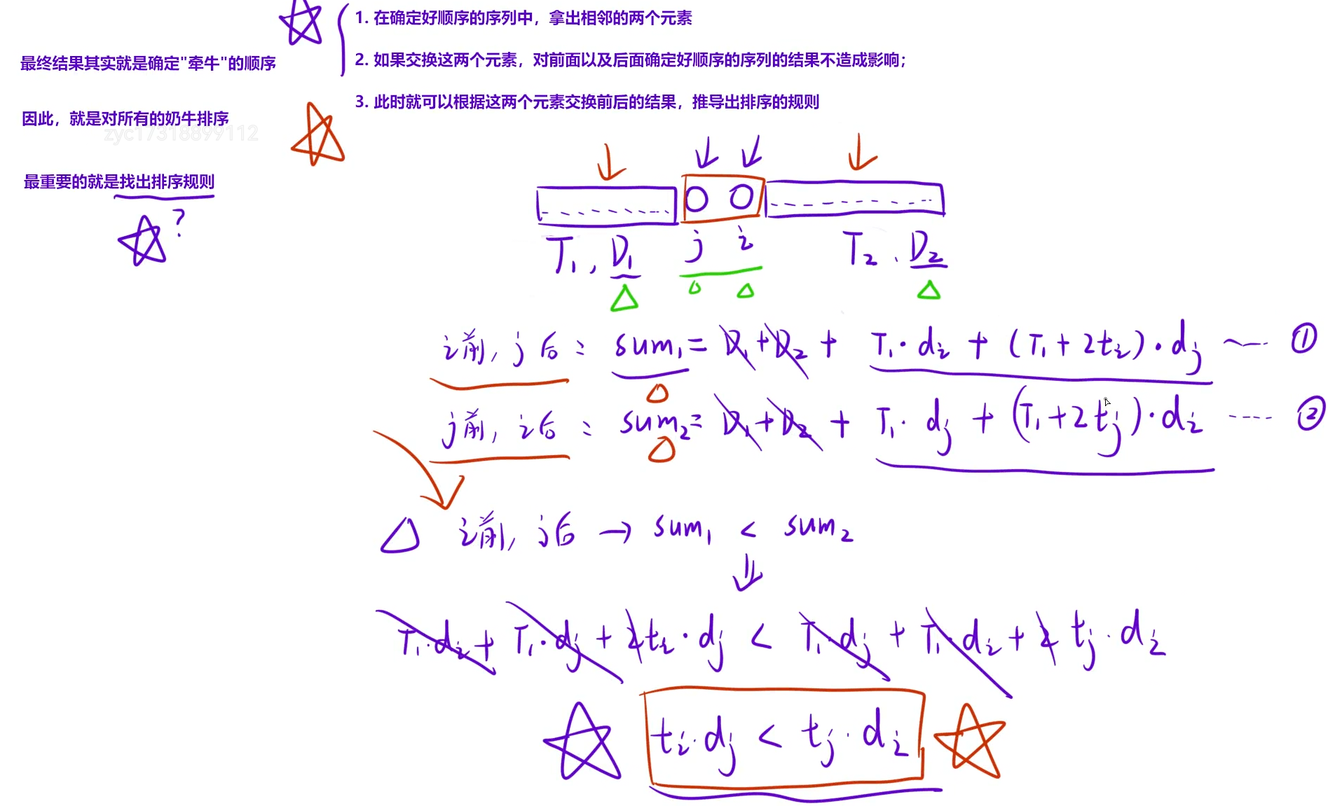 细说的话,这里应该是推公式+排序。其中推公式就是寻找排序规则,排序就是在该排序规则下对整个对象排序。在解决某些问题时,当我们发现最终结果需要调整每个对象的先后顺序,那么就可以使用推公式的方式来得出排序规则,进而对整个对象进行排序。但是这里的证明过程会很麻烦(需要用到离散数学中的"全序关系"),后续题目中我们只要发现该题的最终结果需要排序,并且交换相邻两个元素的时候对其余元素不会产生影响,那么就可以推导出排序的规则,然后直接去排序,就不用证明了。