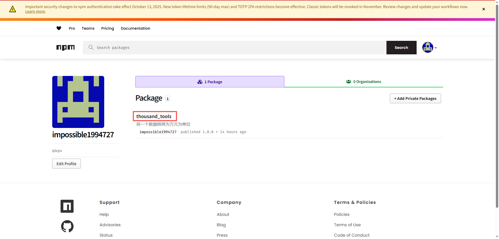 按照上面步骤,登录成功之后,切换到要发布的包的根目录,终端输入npm publish