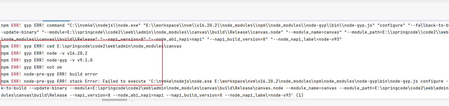 canvas 模块是一个基于 C++ 实现的 Node.js 图形绘图库,在安装时需要进行 C++ 原生扩展编译,而 Node.js 的包管理器(npm)会调用 node-gyp 去执行编译操作。在 Windows 下,如果没有安装 Visual Studio 编译环境,就会导致编译失败,从而报出: