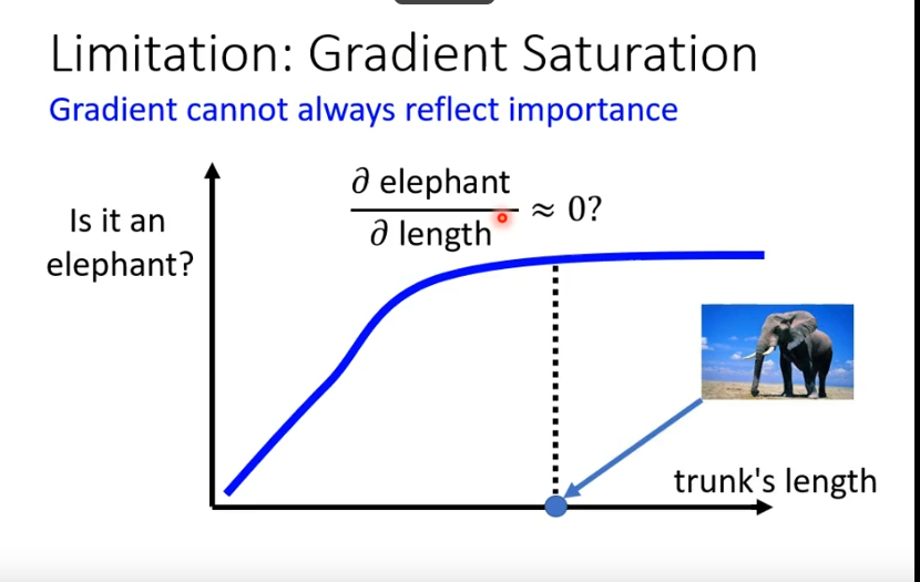 光看gradient并不能完全反应一个部分的重要性。举一个例子,下图中横轴表示某种生物鼻子的长度,纵轴表示生物是大象的可能性。不难看出,在鼻子长度到一个限度之后,即使鼻子更长也不会更像大象,在限度附近会让我们计算的gradient为0。这就可能导致我们得出鼻子长度对是不是大象这件事情不重要,因为鼻子长度变化对是大象的可能性的变化是趋近于0的,但事实上不是这样。
