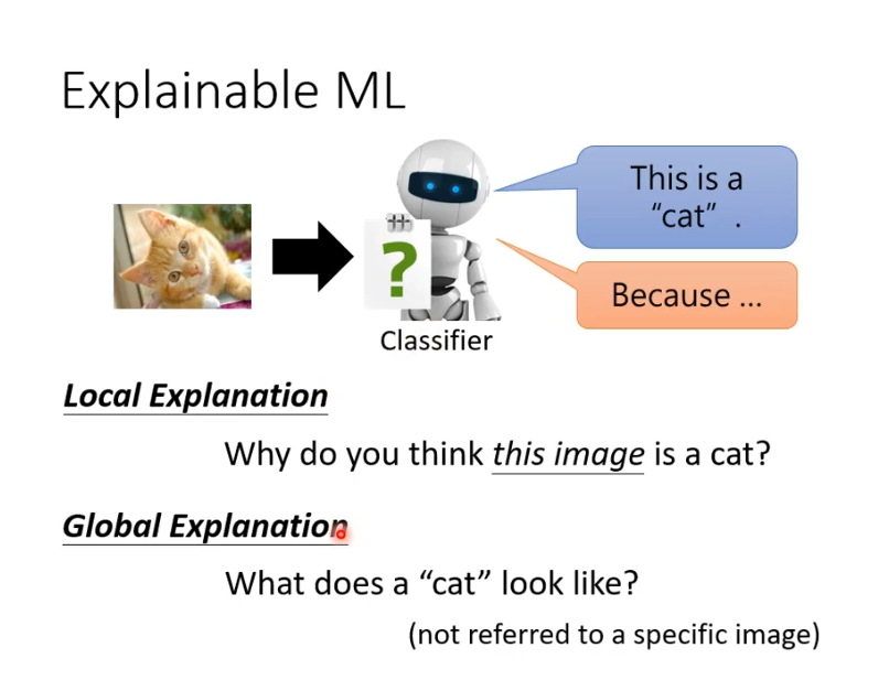 explainable machine learning分为两大类,一种是local explanation,一种是global explanation。假设有一张图片,里面是一只猫,那么我们的问题是:为什么会认为这张图片是一只猫。根据一张图片来回答问题,这叫作local explanation。而global explanation是现在没有给图片,而是问它上面样的图片叫做猫,它并不针对任何一张特定图片分析。