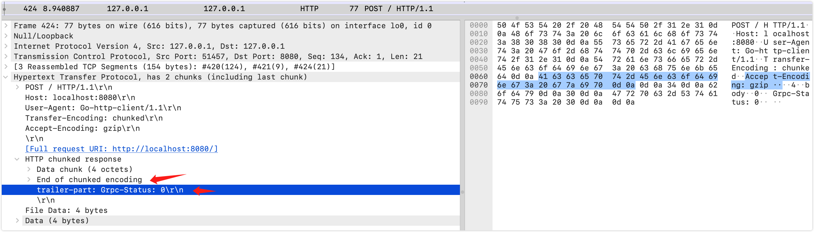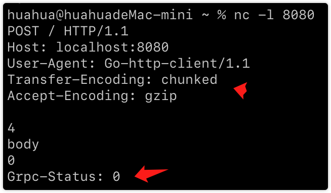 )func grpcStatus(w http.ResponseWriter, r *http.Request) {fmt.Printf("header: %+v\n", r.Header)fmt.Printf("trailer before read body: %+v\n", r.Trailer)data, _ := io.ReadAll(r.Body)w.Header().Add("Transfer-Encoding", "chunked")