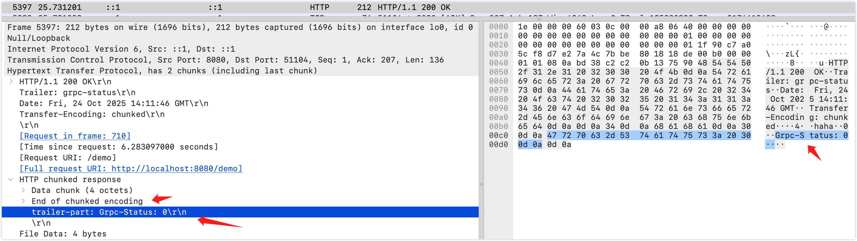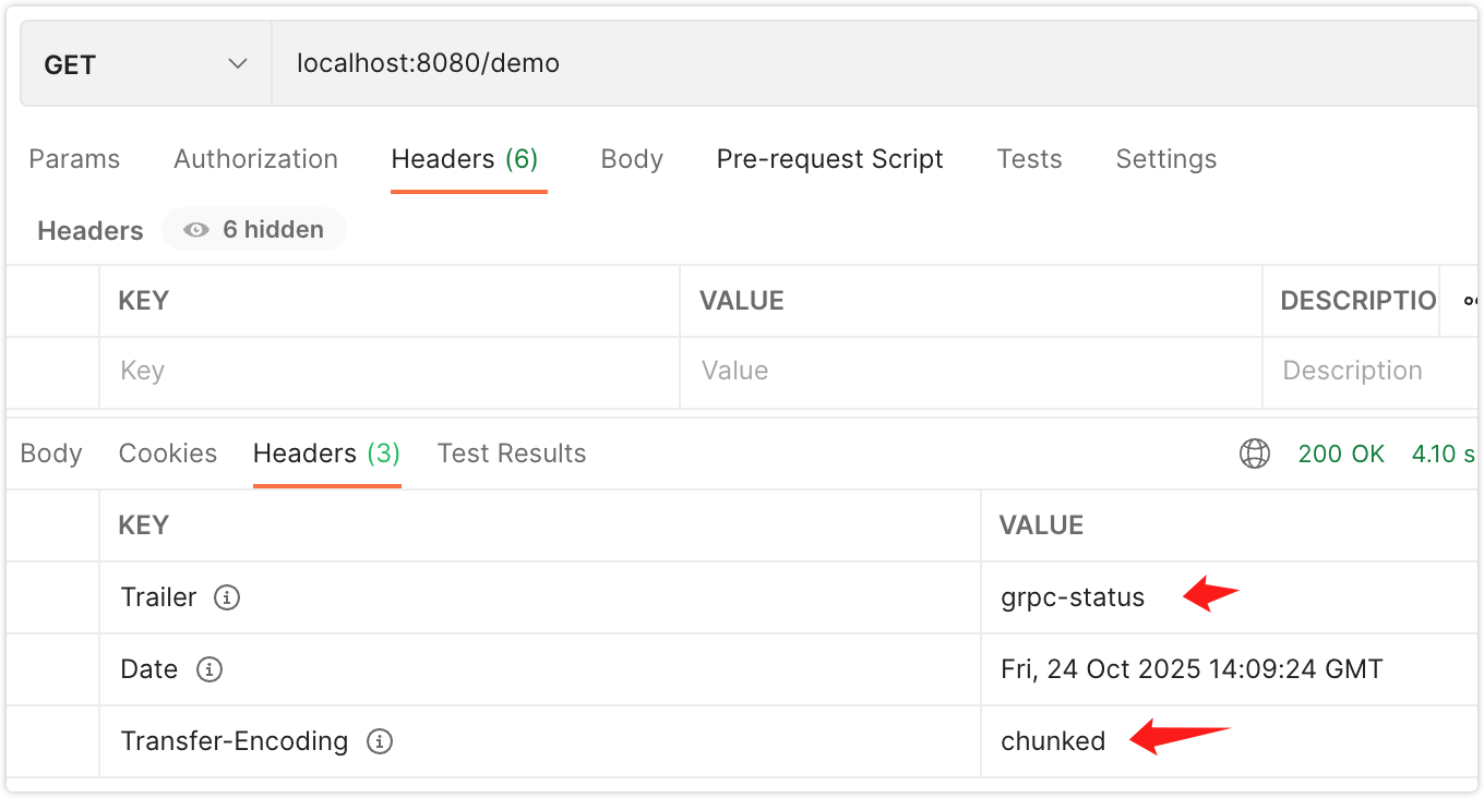 public class DemoController {@GetMapping("/demo")public void demo(HttpServletResponse response) throws IOException {response.addHeader("Transfer-Encoding", "chunked");response.addHeader("Content-Length", String.valueOf(-1));response.addHeader("Trailer", "grpc-status");PrintWriter printWriter = response.getWriter();printWriter.print("body");printWriter.flush();response.addHeader("grpc-status", "0");printWriter.close();}