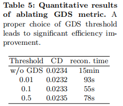 如表 5 所示,不使用 GDS 时,重建时间长达 15 分钟;使用 GDS(阈值 0.1)后,时间缩短至 55 秒,且 CD 仅从 0.0234 升至 0.0233,几乎无质量损失,证明 GDS 的高效性。
