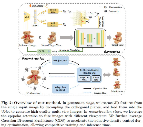 注:左侧为多视角生成阶段(提取几何与语义特征指导扩散模型),右侧为 3D 重建阶段(极线注意力融合多视角 + GDS 加速优化)。
