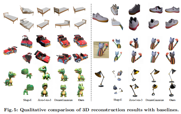 - 基线方法:Zero-1-to-3、Realfusion、Consistent-123、Shap-E、DreamGaussian(覆盖隐式 / 显式 / 混合表示方法);