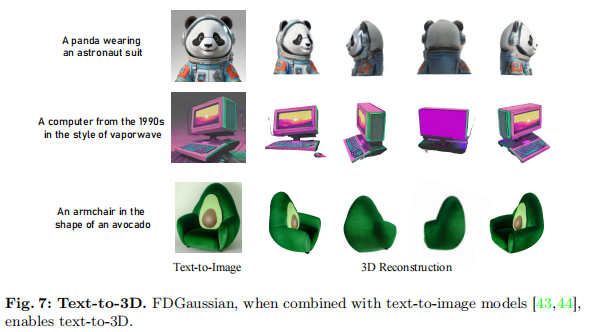 FDGaussian 可与文本到图像模型(如 DALL-E2、Stable Diffusion)无缝结合,实现 “文本→2D 图像→3D 重建” 的端到端流程。如图 7 所示,即使是 “穿宇航服的熊猫”“90 年代电脑(蒸汽波风格)” 等创意场景,FDGaussian 也能准确捕捉细节,甚至还原遮挡部分的几何结构。
