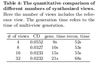如表 4 所示,随着生成视角数量从 4 增加到 16,CD 从 0.0552 降至 0.0233,重建质量显著提升;但视角数量增至 32 时,CD 仅降至 0.0232,时间却从 70 秒增至 89 秒(生成 21 秒 + 重建 68 秒),证明 16 个视角是 “质量 - 效率” 平衡点。