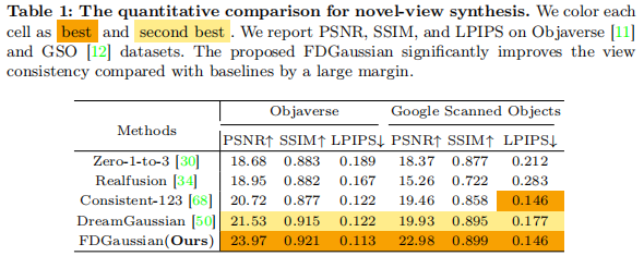 如表 1 所示,FDGaussian 在两个数据集上的 PSNR、SSIM、LPIPS 均优于所有基线,尤其在 Objaverse 上 PSNR 达到 23.97,比第二名 DreamGaussian 高 2.44,证明其多视角一致性与图像质量优势。