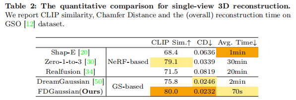 如表 2 所示,FDGaussian 在 CD(0.0232)与 CLIP 相似度(80.0)上最优,且重建时间仅 70 秒,远快于 Zero-1-to-3(30 分钟)与 DreamGaussian(2 分钟),实现 “质量与效率双优”。
