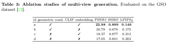 如表 3 所示,移除 “正交平面分解”(几何条件)后,PSNR 从 22.98 降至 18.37,LPIPS 从 0.146 升至 0.212,证明几何条件是保证多视角一致性的关键;移除 “CLIP 语义嵌入” 也会导致性能下降,说明语义约束可提升图像保真度。