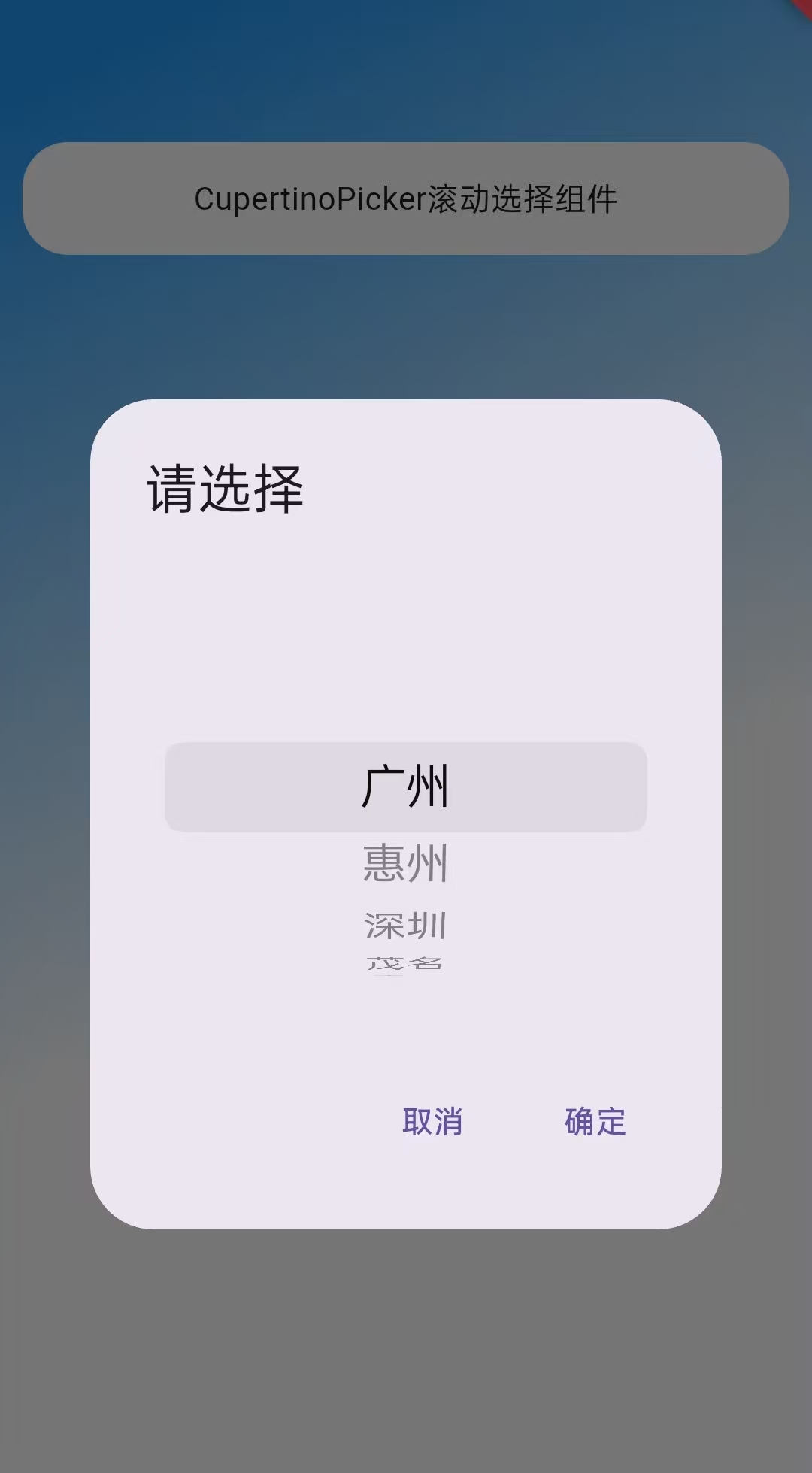 void showPickerDialog() {int selectedIndex = 0;List<String> options = ['广州', '惠州', '深圳', '茂名', '东莞',"韶关"];final controller = FixedExtentScrollController(initialItem: 2);//初始选中项为深圳showDialog(context: context,builder: (context) {return AlertDialog(title: Text('请选择'),content: SizedBox(height: 200,child: CupertinoPicker(itemExtent: 40, //每个选项的高度//diameterRatio: 1.5, // 默认值 1.1,值越大透视效果越小(滑动效果)//magnification: 1, // 中间选项的放大倍数(放大选中的文字)//squeeze: 0.8, // 默认值 1.45,值越小选项间距越大//useMagnifier: true, // 是否使用放大镜效果(好像肉眼看不出什么效果)scrollController: controller,//控制初始选中项onSelectedItemChanged: (index) { //在滚动结束后触发selectedIndex = index;},children: options.map((option) {return Center(child: Text(option));}).toList(),//selectionOverlay: null,// 移除选择覆盖层),),actions: [TextButton(onPressed: () => Navigator.pop(context),child: Text('取消'),),TextButton(onPressed: () {print('选择了: ${options[selectedIndex]}');Navigator.pop(context);},child: Text('确定'),),],);},);}