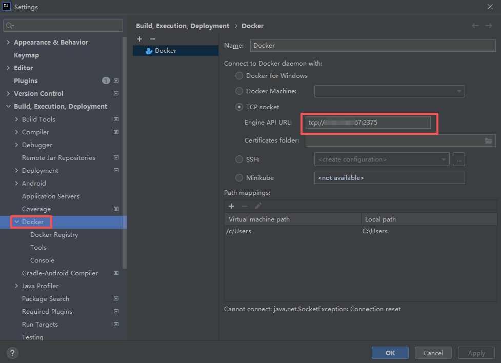Linux 或远程 Docker:选择 TCP Socket 并填入主机 IP 和端口(默认