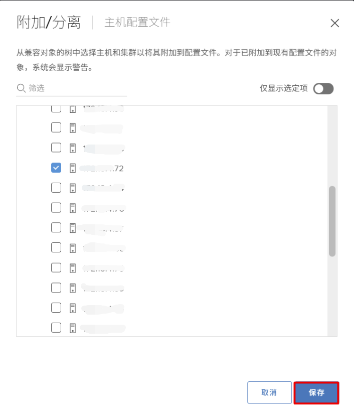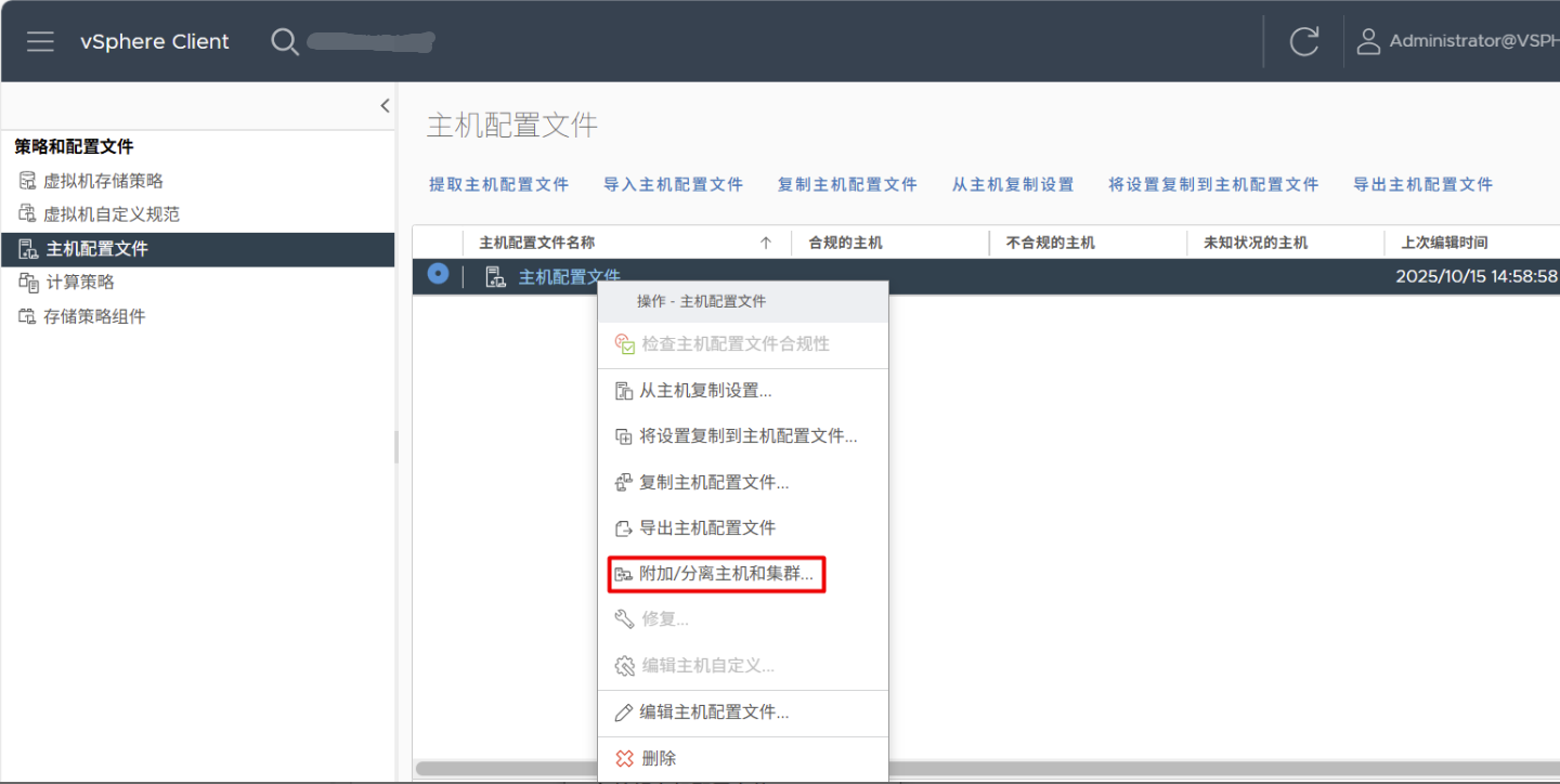 - 右键单击新的主机配置文件,打开“操作”菜单。选择“附加/分离主机和集群...”,然后在向导中选择主机。
