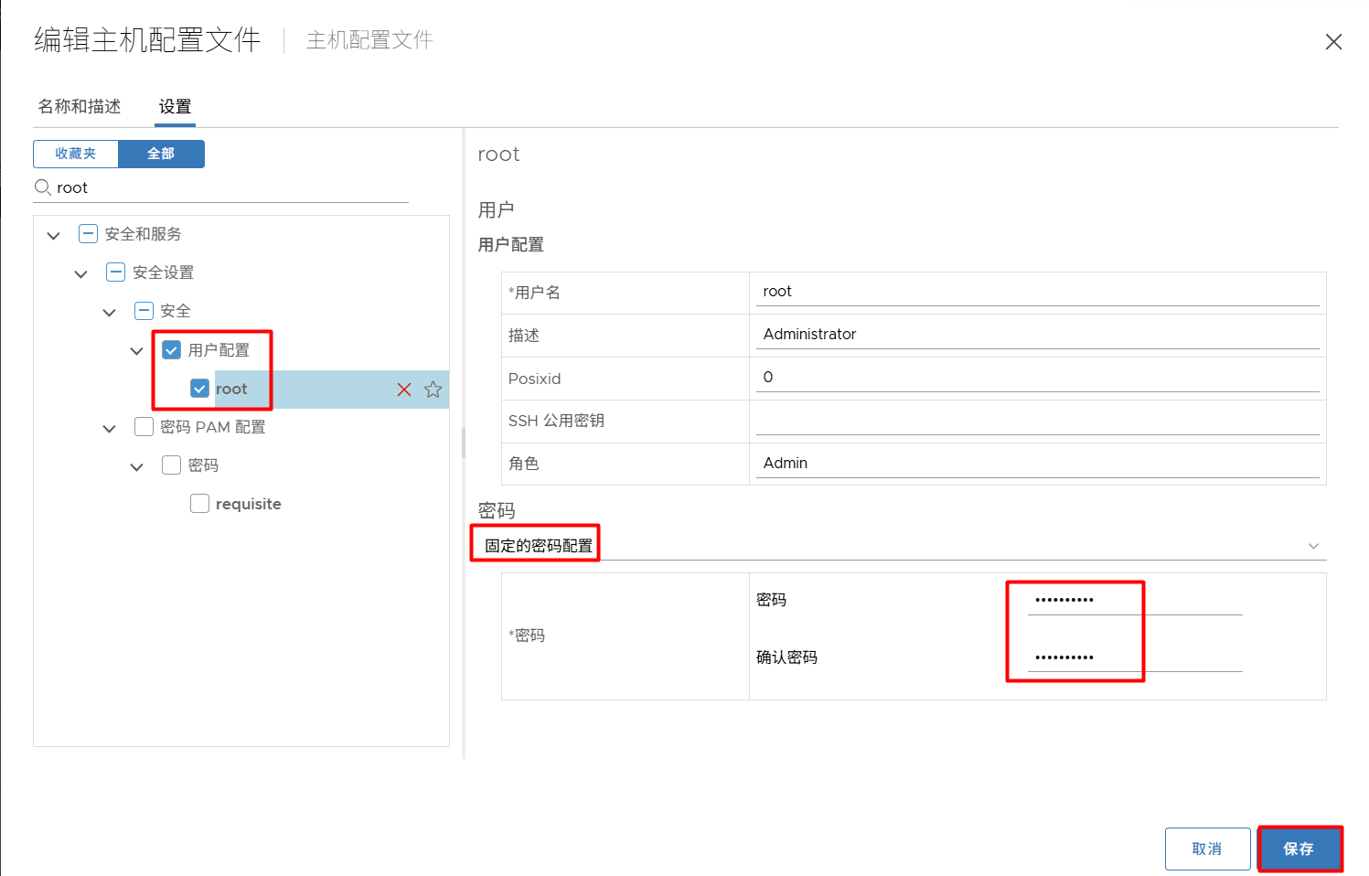- 安全和服务 > 安全设置 > 安全 > 用户配置 > root >