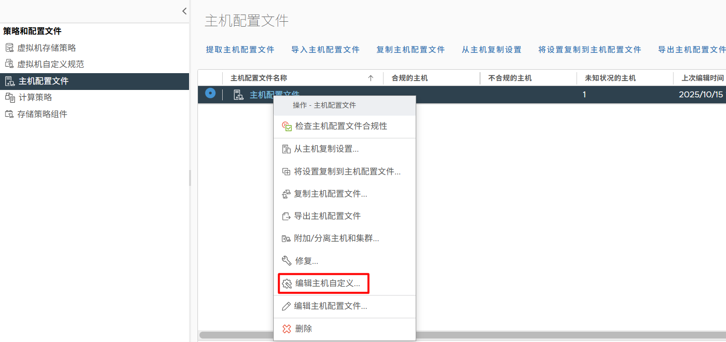 - 右键单击新的主机配置文件,打开“操作”菜单。选择“编辑主机自定义”。