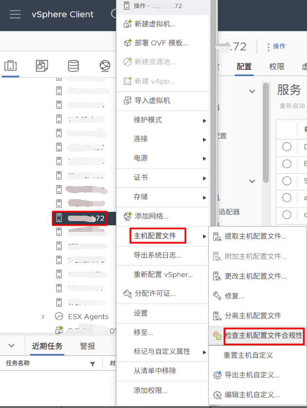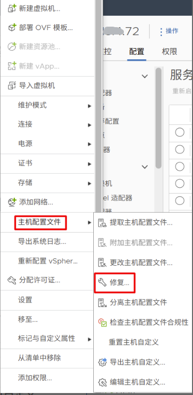- 右键单击清单中的 ESXi 主机。 然后选择“主机配置文件”>“修复...”