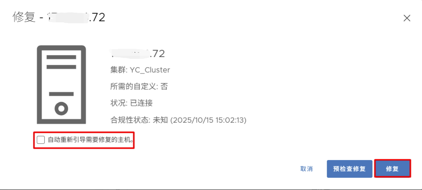 **注意**:取消选择“自动重新启动需要修复的主机”,否则这将重新启动 ESXi 主机。