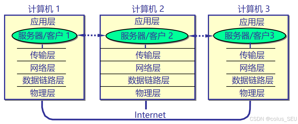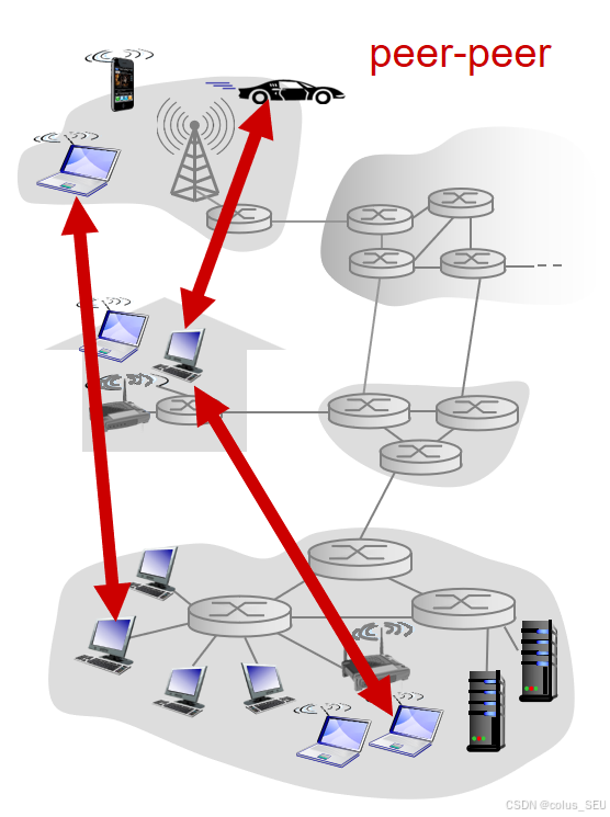 核心特征:没有(或极少依赖)专门的服务器。应用程序在间断连接的主机(称为对等方)之间直接通信。任意的终端系统直接通信,在请求服务的同时也提供服务。