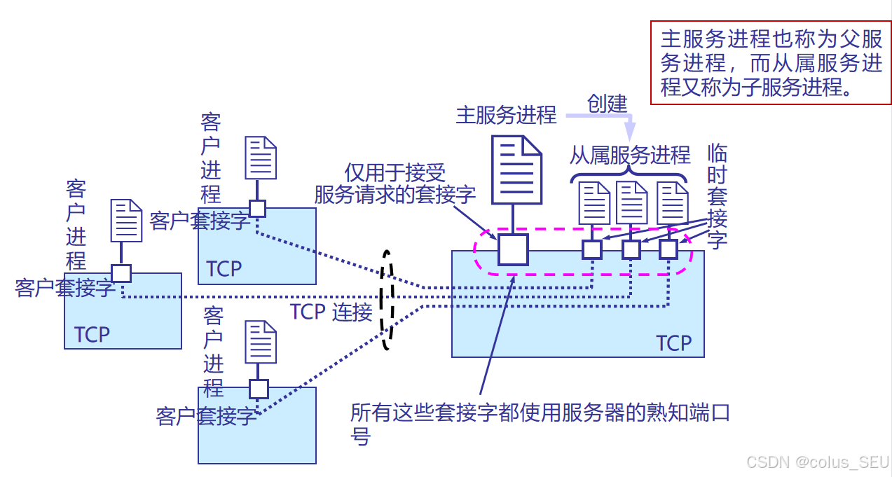 主服务进程在熟知端口等待客户进程发出的请求。一旦收到客户的请求,就创建一个从属服务进程,并指明从属服务进程使用临时套接字与该客户建立TCP连接,然后主服务进程继续在原来的熟知端口等待向其他客户提供服务