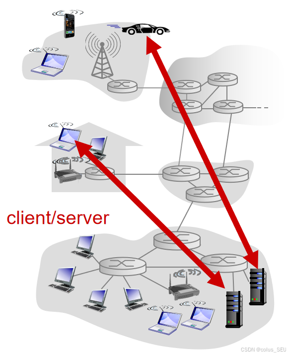 核心特征:有一个总是打开的主机,称为服务器,它提供服务。许多其他主机,称为客户端,向服务器请求并接收服务。