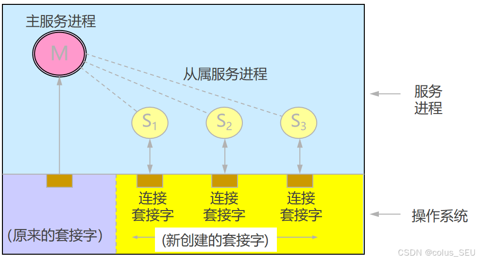 主进程立即返回,继续在熟知端口上监听新的连接请求,而新创建的从属进程负责与对应的客户进行后续的所有数据交换。