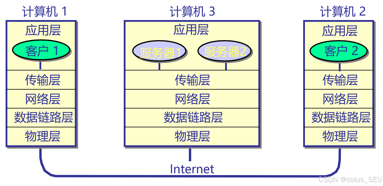 进程:在端系统上运行的程序。同一主机进程间通信使用操作系统定义的方式(管道,信号量,共享内存);不同端系统(主机)上的进程通过计算机网络交换报文来通信。