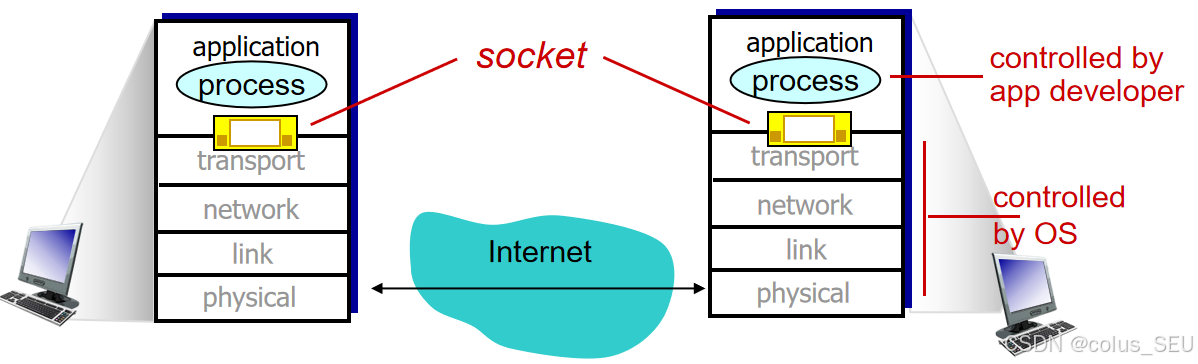 开发者控制权:开发者可以控制套接字在应用层端的一切(如选择传输协议、设置报文内容),但对套接字的传输层端几乎无控制权(传输层的具体操作由操作系统内核实现)。