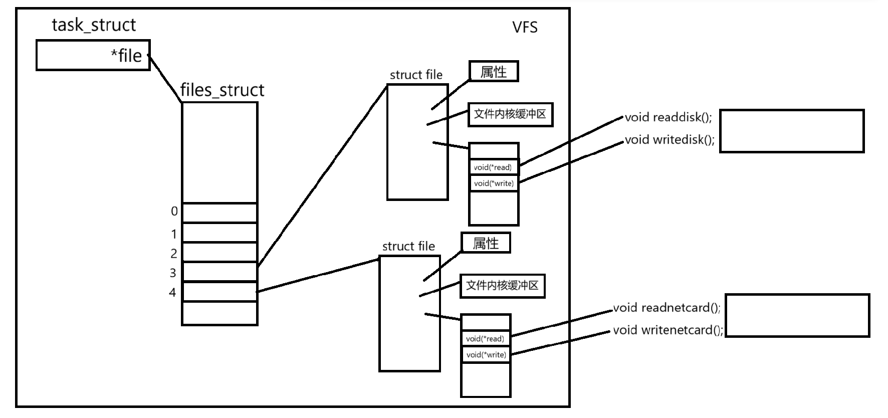 假设现在我们新建一个进程,这个进程通过files_struct里的文件操作符表访问到各个硬件的struct file,在struct file中保存着硬件的属性,文件内核缓冲区,和底层设备的文件操作表。在文件操作表这个结构体(struct file_operations)中,存储着连接底层硬件访问接口的函数指针,而这些函数指针呢,又各自指向了由驱动程序提供的访问方法。对于这个进程来说,如果他想访问显示器,它只需要调用struct file中存储的void (*write)()函数指针,他并不关心底层的访问接口到底是什么样子的。我们把给进程封装的文件视角叫做虚拟文件系统,简称VFS。