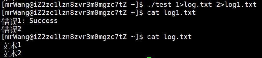 现在,我们执行以下代码,并把标准输出和标准错误重定向到两个不同的文件: