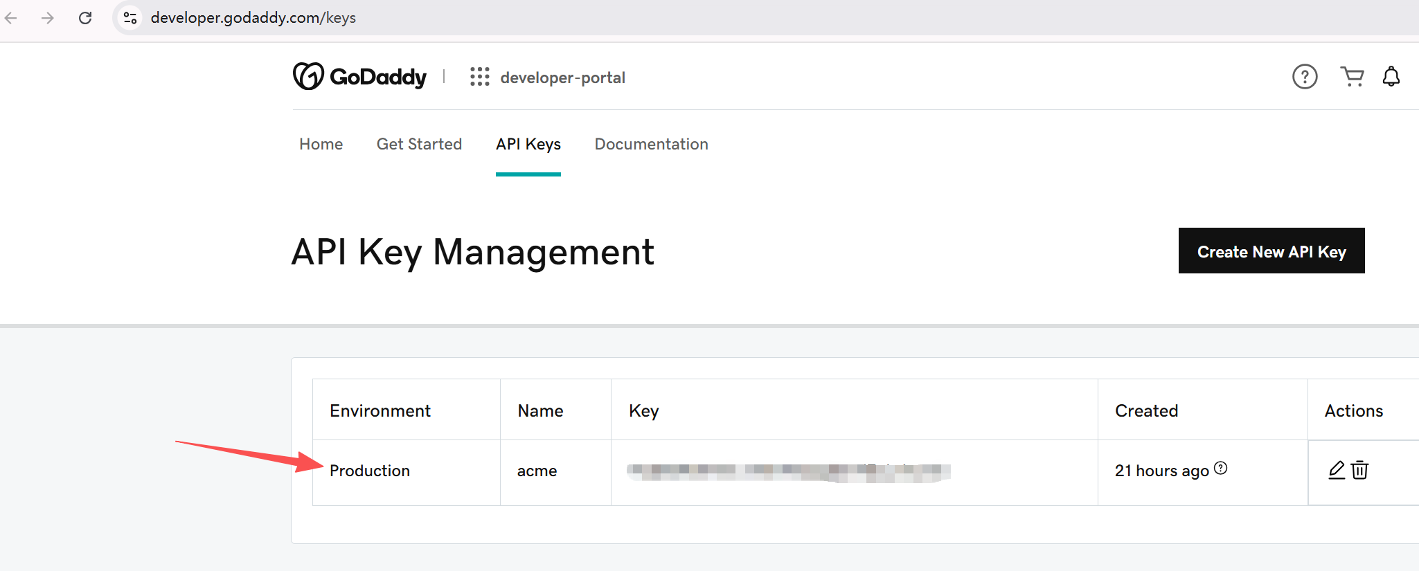 因为我使用的域名服务商是GoDaddy,访问这个链接获取API Key。
