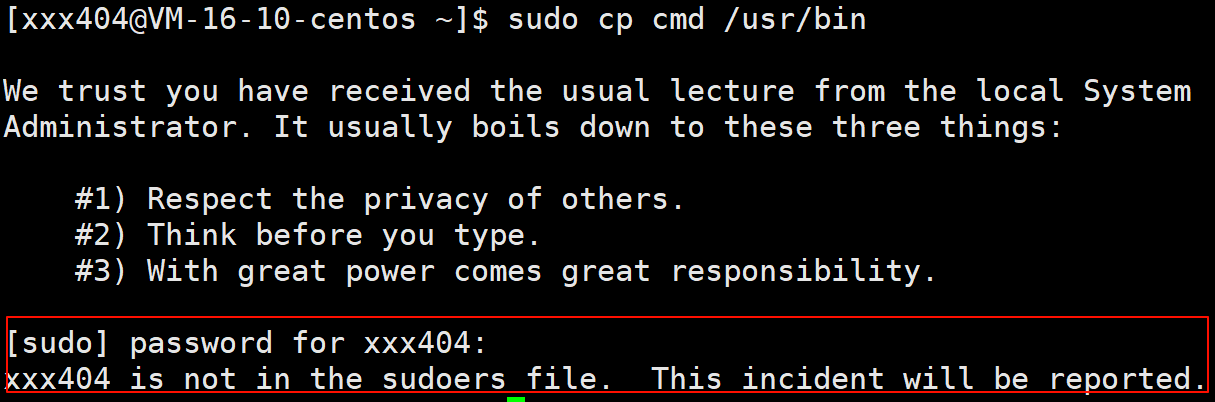回顾上篇文章结尾,以普通用户通过sudo提权为示例,但实际上,普通用户是无法进行sudo的,一般会遇到下面的情形: