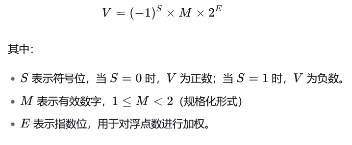 根据国际标准IEEE(电气和电子工程协会)754,任意一个二进制浮点数V可以表示成下面的形式