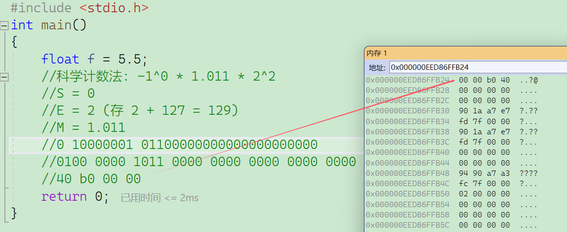 下面我们举例说明5.5是如何在内存中存储的