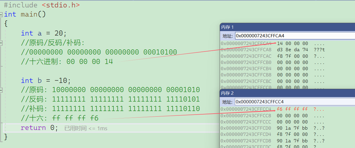我们分别定义了一个正整数和一个负整数,并手动推到了原码反码补码以及十六进制表示,然后调试观察a和b在内存中的存储,发现整体和我们推导的一致,内存中的确存储的是整数的补码形式,但是字节的顺序好像不太一致~