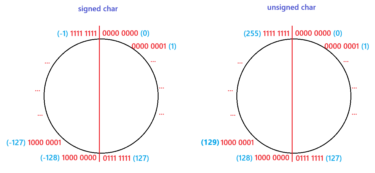 {char a = -1; signed char b = -1;unsigned char c = -1;printf("a=%d,b=%d,c=%d", a, b, c); //-1, -1, 255return 0;