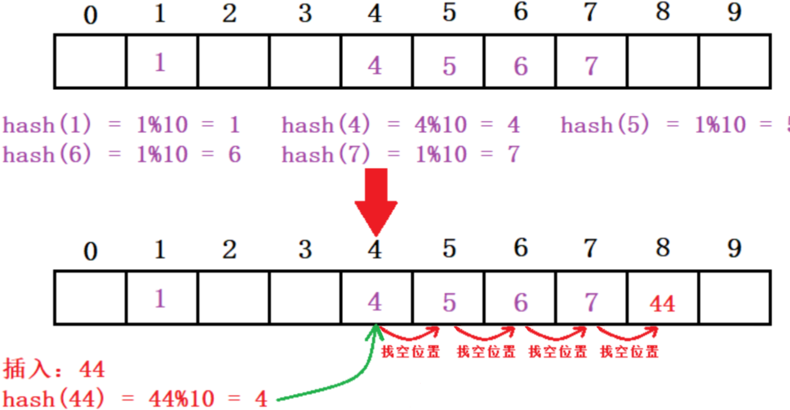 1.从发生冲突的位置开始,依次线性向后探测,直到寻找到下⼀个没有存储数据的位置为止,如果走到哈希表尾,则回绕到哈希表头的位置。