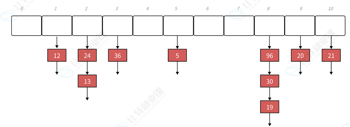 链地址法相当于是vector中的每个元素都变成了链表,冲突的元素利用链表连接即可,因此也被形象地称为哈希桶