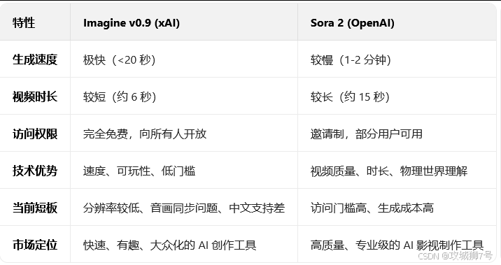 OpenAI的Sora 2代表了“精英路线”,它严谨、强大,追求技术的极致,希望定义行业的最高标准。而xAI的Imagine v0.9则走了“平民路线”,它粗糙、直接,用免费和开放换取最广泛的用户,试图在混乱中建立新的秩序。