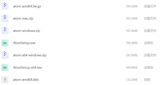 网盘中包含了适用于 Windows、Linux 和 Mac OS 多个平台的 Atom 安装包,如下图所示: