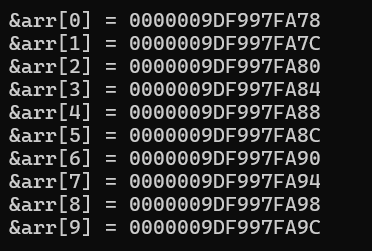 {int arr[10] = { 0 };int i = 0;int sz = sizeof(arr) / sizeof(arr[0]);for (i = 0; i < sz; ++i){printf("&arr[%d] = %p\n", i, &arr[i]);}return 0;