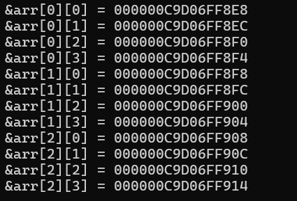 {int arr[3][4];for (int i = 0; i < 3; i++){for (int j = 0; j < 4; j++){printf("&arr[%d][%d] = %p\n", i, j, &arr[i][j]);}}return 0;