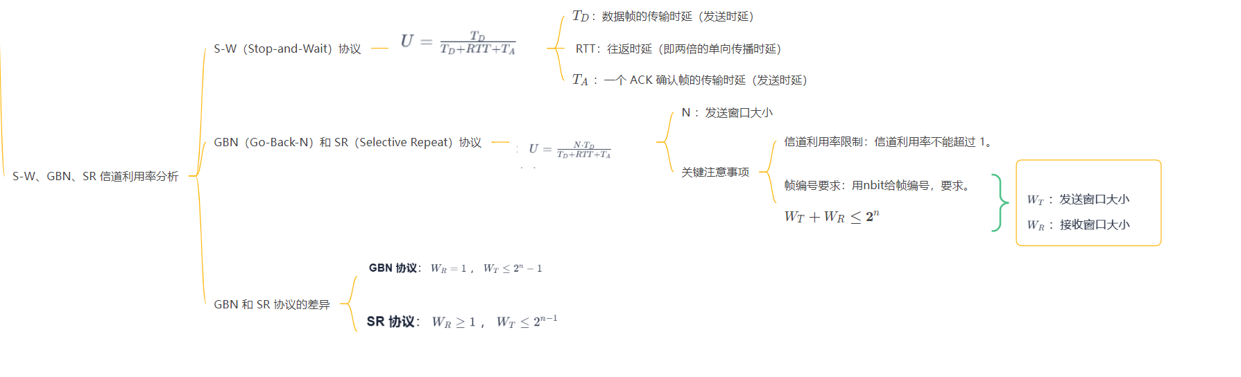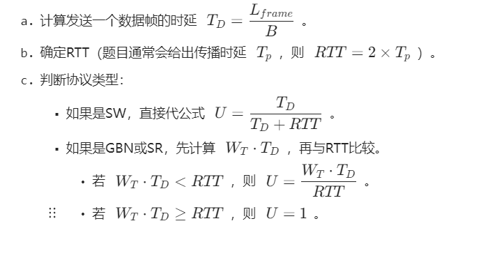 | RTT(往返时延) | 数据帧传到接收方 + ACK 传回发送方的总时间 | 快递从站点送到客户,再把签收单寄回站点的总时间 | 由 “配送距离(物理距离)” 和 “运输速度(信号传播速度)” 决定,题目常给传播时延 |