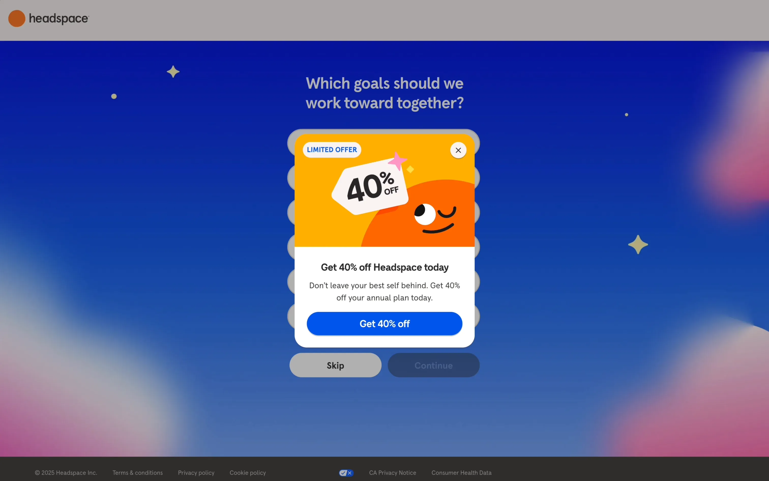 界面在交互设计中注重给用户 “被回应” 的情感满足,同时尊重用户决策。例如勾选框的动效、按钮的微交互(如 Gemini 界面的卡片 hover 反馈),让每一步操作都有即时反馈,减少用户的操作焦虑;而 Headspace 优惠弹窗提供 “Get 40% off” 和 “Skip” 两个选项,避免强制营销带来的反感,体现了对用户自主决策的尊重,提升了用户的情感舒适度。