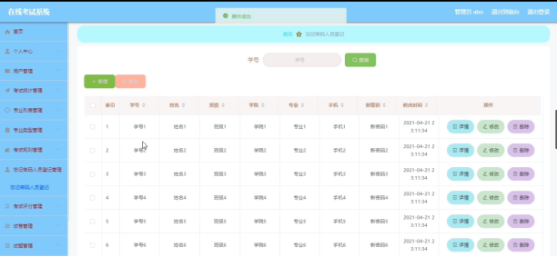 系统管理员可以查看对考试统计进行添加,修改,删除以及查询操作。具体界面如图所示。