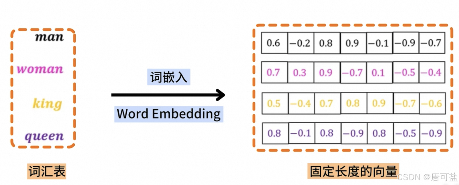 - 低维稠密:Embedding向量通常是几十到几百维,每一维都包含有意义的信息(可能代表了某种语法或语义特征),没有浪费的空间。