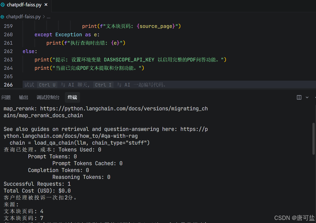 if has_api_key and knowledgeBase is not None:# 导入Tongyi LLMfrom langchain_community.llms import Tongyitry:llm = Tongyi(model_name="deepseek-v3", dashscope_api_key=DASHSCOPE_API_KEY) # qwen-turbo# 设置查询问题query = "客户经理被投诉了,投诉一次扣多少分"#query = "客户经理每年评聘申报时间是怎样的?"if query:# 执行相似度搜索,找到与查询相关的文档docs = knowledgeBase.similarity_search(query,k=2)# 加载问答链chain = load_qa_chain(llm, chain_type="stuff")# 准备输入数据input_data = {"input_documents": docs, "question": query}# 使用回调函数跟踪API调用成本with get_openai_callback() as cost:# 执行问答链response = chain.invoke(input=input_data)print(f"查询已处理。成本: {cost}")print(response["output_text"])print("来源:")# 记录唯一的页码unique_pages = set()# 显示每个文档块的来源页码for doc in docs:text_content = getattr(doc, "page_content", "")source_page = knowledgeBase.page_info.get(text_content.strip(), "未知")if source_page not in unique_pages:unique_pages.add(source_page)print(f"文本块页码: {source_page}")except Exception as e:print(f"执行查询时出错: {e}")